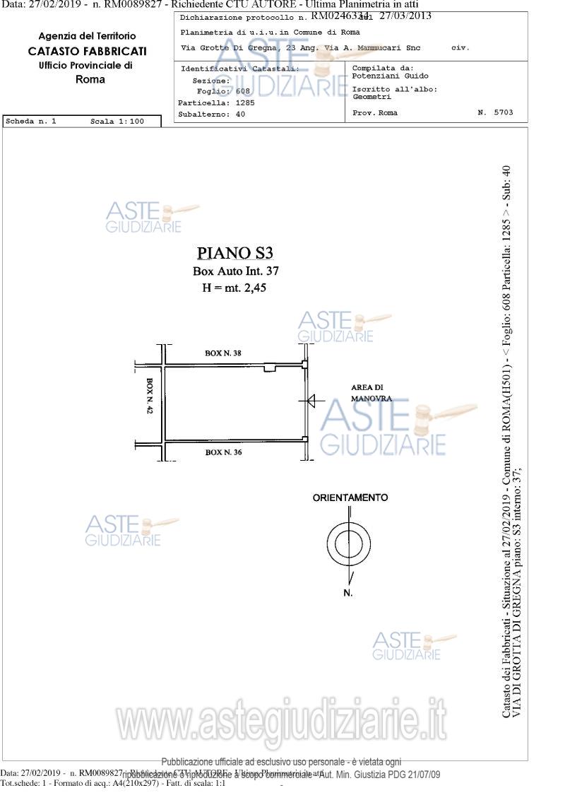 Proprietà piena ed esclusiva di box auto sito in comune di Roma (RM), quartiere "Collatino", municipio IV, via di Grotta di Gregna 23, piano S3, interno 37, posto all'interno di un edificio interrato con destinazione d'uso autorimessa, avente una superficie lorda di 14 mq. e un’altezza di circa 2,45 m