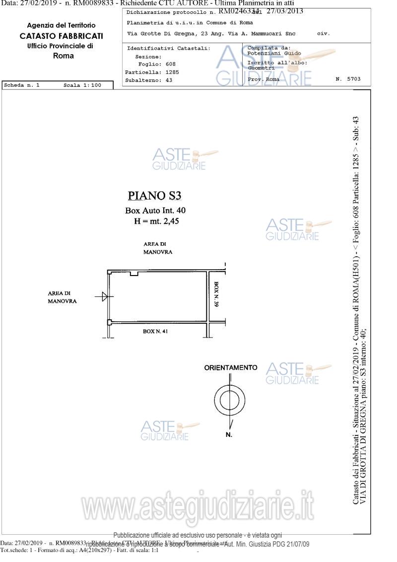 Proprietà piena ed esclusiva di box auto sito in comune di Roma (RM), quartiere "Collatino", municipio IV, via di Grotta di Gregna 23, piano S3, interno 40, posto all'interno di un edificio interrato con destinazione d'uso autorimessa, avente una superficie lorda di 14,30 mq. e un’altezza di circa 2,45 m