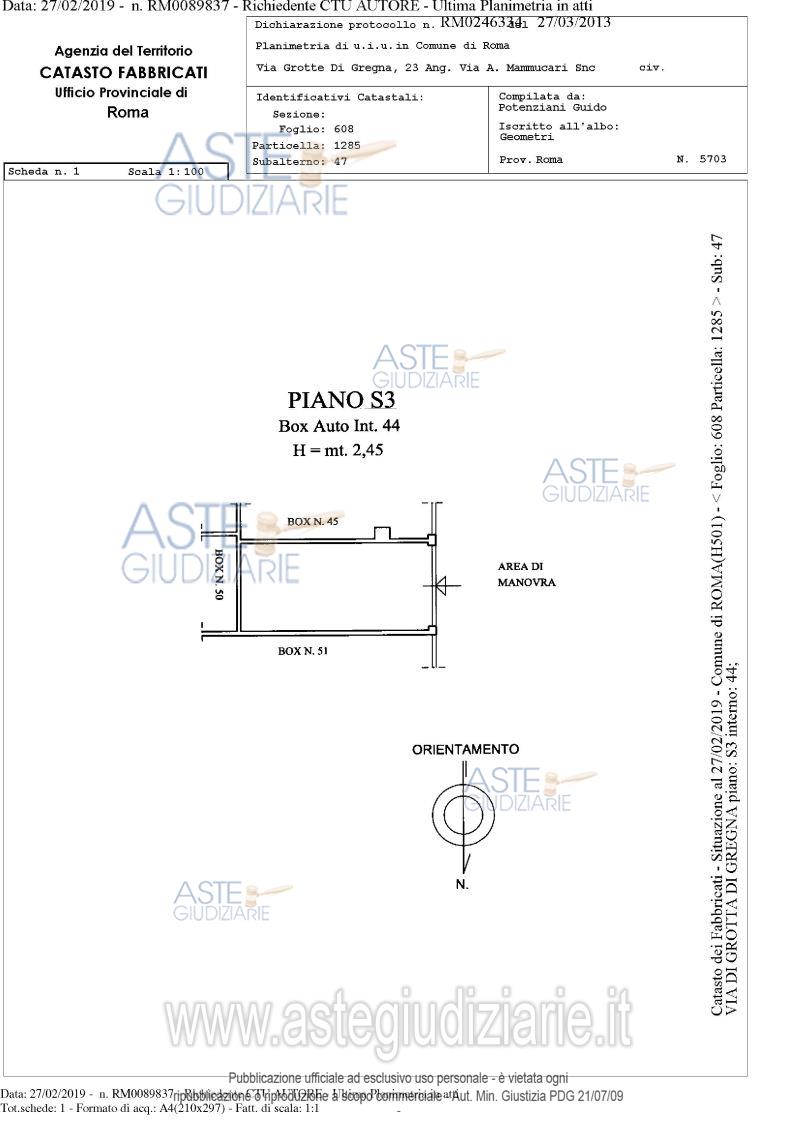 Proprietà piena ed esclusiva di box auto sito in comune di Roma (RM), quartiere "Collatino", municipio IV, via di Grotta di Gregna 23, piano S3, interno 44, posto all'interno di un edificio interrato con destinazione d'uso autorimessa, avente una superficie lorda di 13,40 mq. e un’altezza di circa 2,45 m