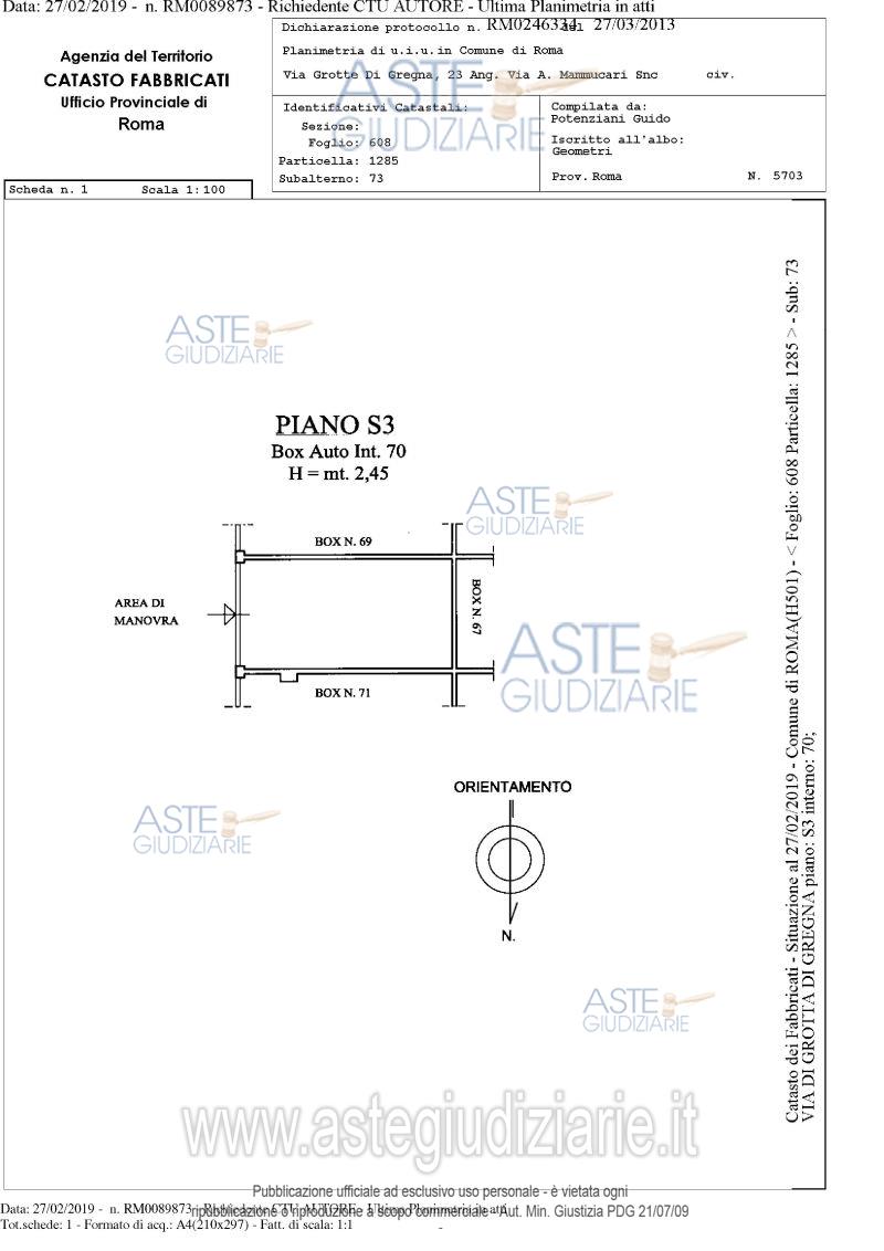 Proprietà piena ed esclusiva di box auto sito in comune di Roma (RM), quartiere "Collatino", municipio IV, via di Grotta di Gregna 23, piano S3, interno 70, posto all'interno di un edificio interrato con destinazione d'uso autorimessa, avente una superficie lorda di 14 mq. e un’altezza di circa 2,45 m