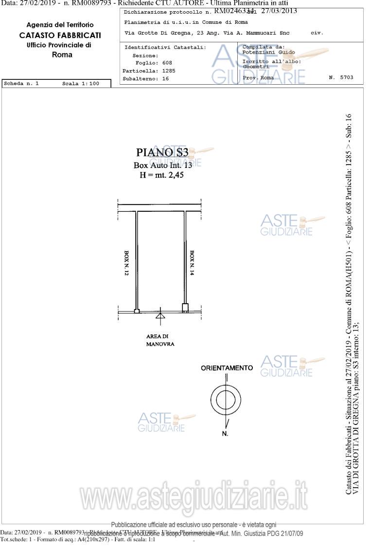 Proprietà piena ed esclusiva di box auto sito in comune di Roma (RM), quartiere "Collatino", municipio IV, via di Grotta di Gregna 23, piano S3, interno 13, posto all'interno di un edificio interrato con destinazione d'uso autorimessa, avente una superficie lorda di 15 mq. e un’altezza di circa 2,45 m