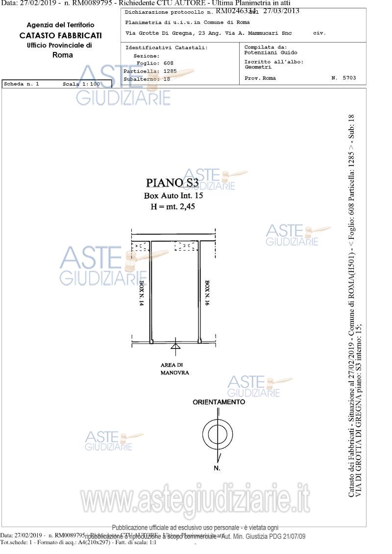 Proprietà piena ed esclusiva di box auto sito in comune di Roma (RM), quartiere "Collatino", municipio IV, via di Grotta di Gregna 23, piano S3, interno 15, posto all'interno di un edificio interrato con destinazione d'uso autorimessa, avente una superficie lorda di 14,85 mq. e un’altezza di circa 2,45 m