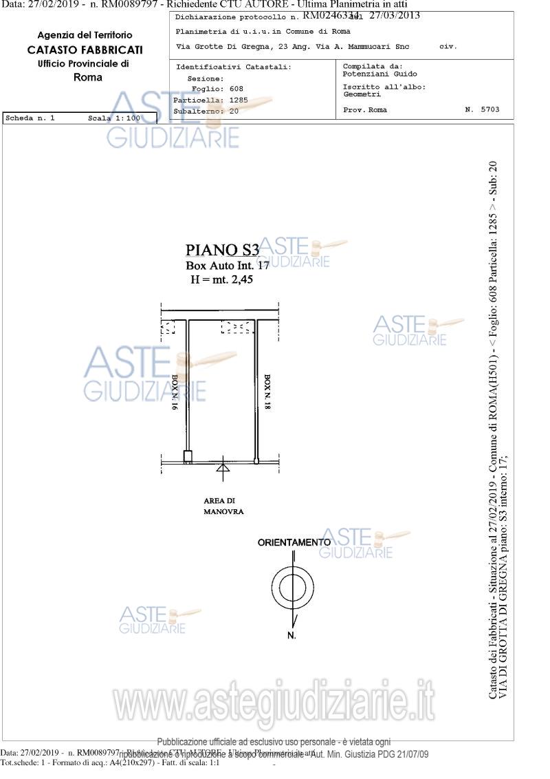 Proprietà piena ed esclusiva di box auto sito in comune di Roma (RM), quartiere "Collatino", municipio IV, via di Grotta di Gregna 23, piano S3, interno 17, posto all'interno di un edificio interrato con destinazione d'uso autorimessa, avente una superficie lorda di 15 mq. e un’altezza di circa 2,45 m