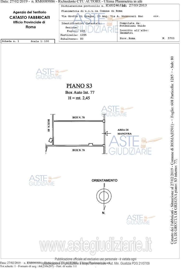 Proprietà piena ed esclusiva di box auto sito in comune di Roma (RM), quartiere "Collatino", municipio IV, via di Grotta di Gregna 23, piano S3, interno 77, posto all'interno di un edificio interrato con destinazione d'uso autorimessa, avente una superficie lorda di 15 mq. e un’altezza di circa 2,45 m