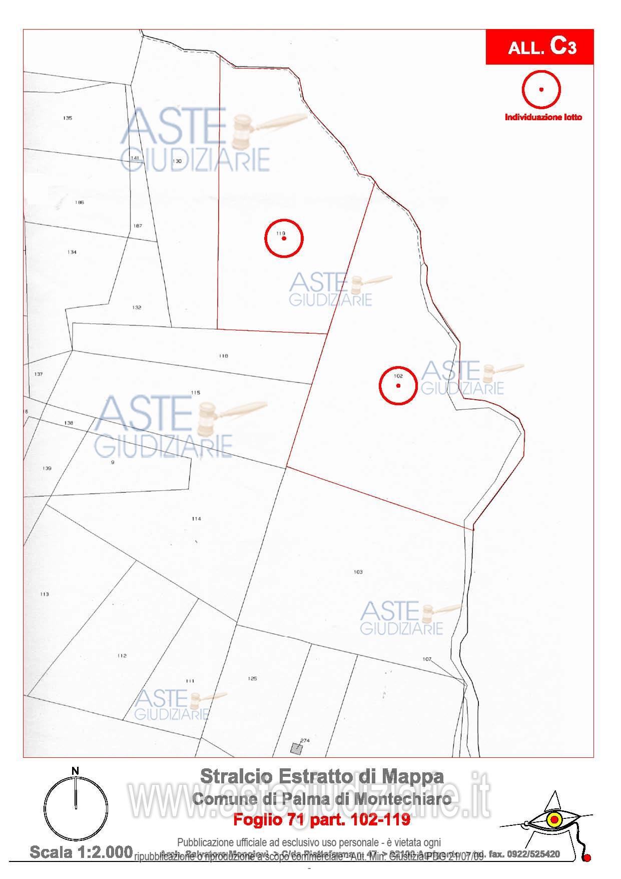 B -Piena Proprietà per la quota di 1000/1000 relativamente ad un Terreno agricolo sito nel comune di Palma di Montechiaro (Ag) nella Contrada Perciaquartare, identificato al N.C.T. al Foglio di Mappa n. 71 part.lle n. 102 e 119 dell’estensione complessiva di 32.740 mq.