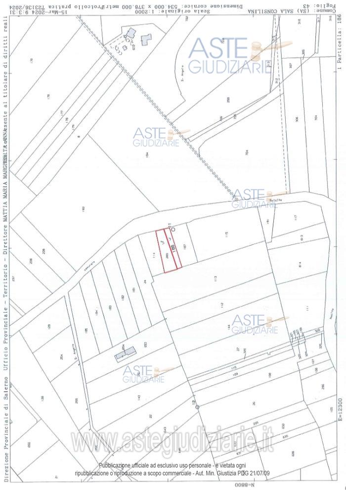 Terreni siti nel Comune di Sala Consilina (SA), individuati catastalmente al Foglio n°43 Particelle 186-289 I terreni sopra indicati ricadono in “zona E” del P.R.G. vigente, classificata come zona agricola e catastalmente come VIGNETO di classe 2. La stessa area ricade nel P.A.I. - Piano Stralcio per l'Assetto Idrogeologico- e non è sottoposta ad alcun vincolo. I due terreni sono tra di loro contigui e sono ubicati in zona periferica rispetto al centro urbanizzato e storico. Dal punto di vista morfologico, gli stessi risultano essere pianeggianti e risultano essere accessibili da strada comunale. Gli stessi hanno una superficie commerciale complessiva pari a mq 931,00. Attualmente, i terreni sono incolti e in stato di abbandono.