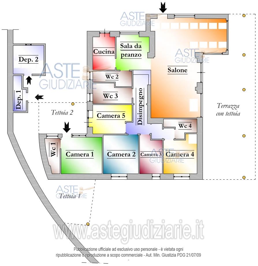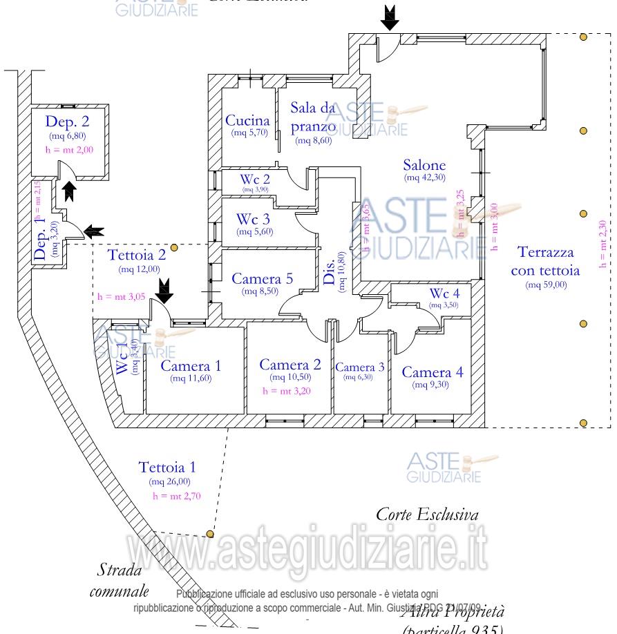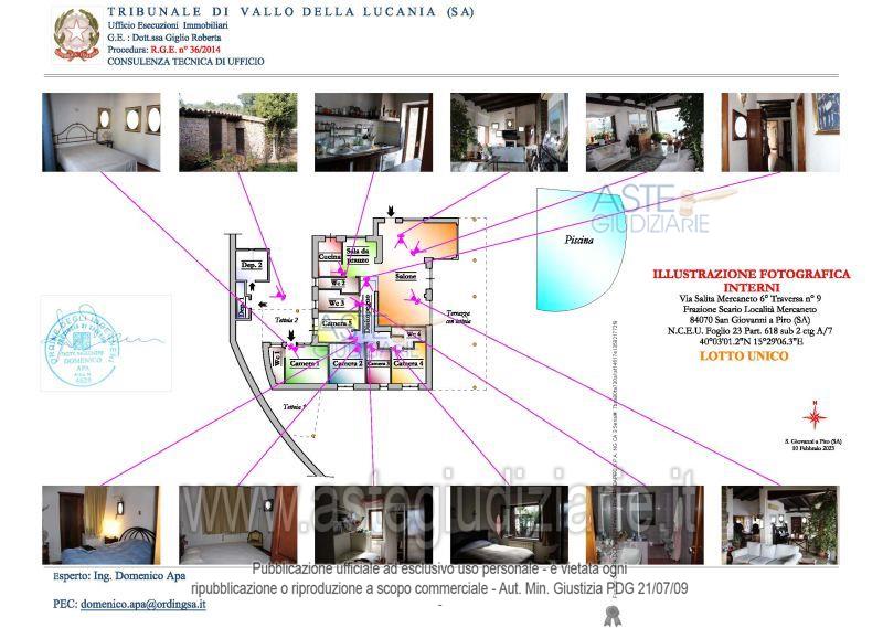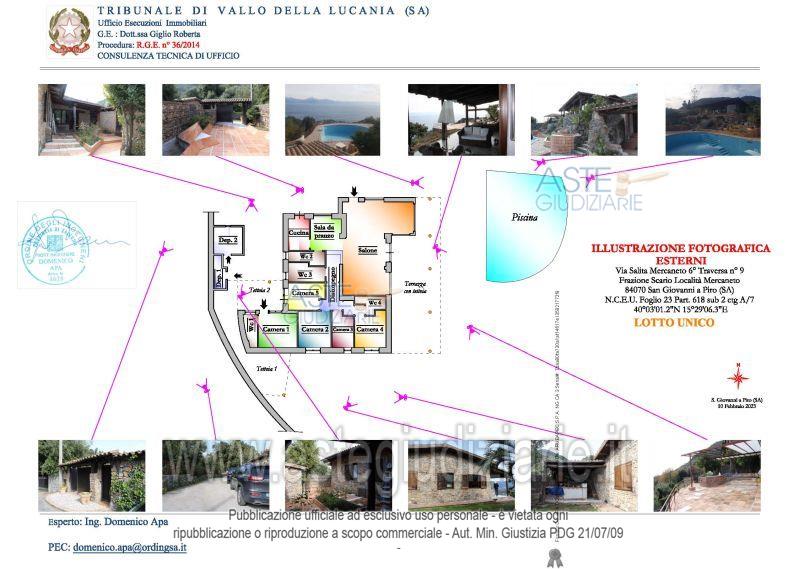 Piena ed esclusiva proprietà di un abitazione in villa con corte e locali pertinenziali e terrenoadibito a strada. L’abitazione in villa, si sviluppa su un unico piano per una superficiecalpestabile complessiva di circa mq 130,00. Essa è composta da un salone, una cucina, unasala da pranzo, un disimpegno, n. 4 WC e n. 5 camere (di cui una, con annesso wc, presenta unaccesso indipendente rispetto alla villa) oltre a n. 2 locali esterni, n. 2 tettoie, una terrazza contettoia ed una corte esclusiva che circonda tutta l’abitazione.La corte esterna, della superficie di circa mq 965 risulta in parte pavimentata e in partecostituita da aiuola. Sono inoltre presenti delle scale adoperate per raggiungere i livelliinferiori della corte dove sono collocati dei locali a servizio della villa. Sul lato Est della corte èpresente una piscina interrata, di forma irregolare, della superficie di mq 90,00.