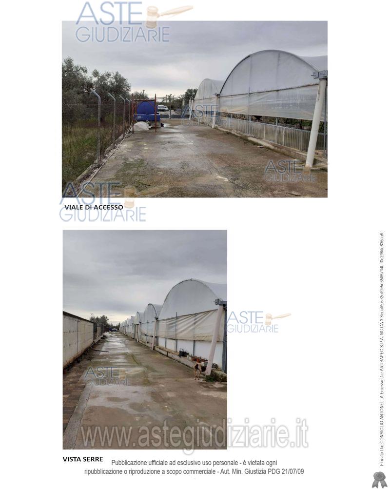 Serra ubicata a Terlizzi (BA) - Via Passatella n. 23, piano T. Il bene sito in agro di Terlizzi è costituito da un terreno di natura calcarea sul quale sono state realizzate serre per la produzione floricola - orticola. Ad esso si accede sia direttamente da strada comunale Centovigne che da via Passatella, tramite il viale di accesso identificato come Bene n. 1. Identificato al catasto Terreni - Fg. 27, Part. 530, Porz. AA - AB, Qualità Serra – Uliveto L'immobile viene posto in vendita per il diritto di Proprietà (1/1) Destinazione urbanistica: Il bene oggetto di stima è ubicato in agro di Terlizzi alla contrada "Pezza Cento Vigne". In base al PRG del Comune di Terlizzi (BA), il bene ricade in zona omogenea di tipo "E Agricola" e in ambito esteso "C" del PUTT/P approvato il 15/12/2000. Con riferimento al PPTR il bene risulta inserito nell'ambito degli ulteriori contesti paesaggistici in aree delle "Componenti culturali e insediative - Paesaggi rurali Sussiste corrispondenza tra lo stato dei luoghi e la planimetria catastale esistente nonché con quanto presente nell’atto di pignoramento. Risulta un contratto di locazione in essere del 22/04/2024 registrato il 15/05/2024 nonopponibile alla procedura. Il bene n. 4 confina a Nord con p.lla 567 di altra proprietà e con p.lla 44 di altra proprietà; ad Est con p.lla 531 di proprietà del debitore esecutato; a Sud con p.lla 637 di altra proprietà; ad Ovest con strada comunale “Cento vigne"
