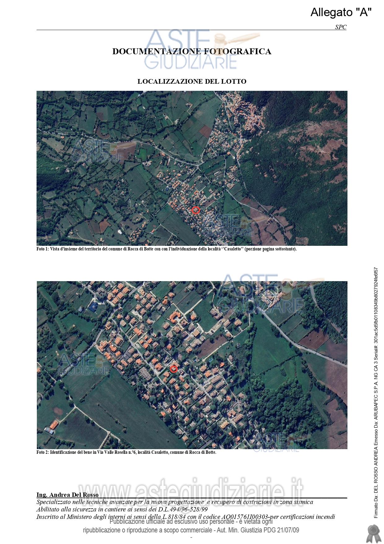 Villetta ubicata a Rocca di Botte (AQ) - Via Valle Rosella 6, Località Casaletto, piano PT-P1. Trattasi di una porzione ad angolo di una schiera di villini posti a ''C'' sito in un rione di abitazioni a ridosso di Rocca di Botte, piccolo comune raggiungibile dalla Via Tiburtina Valeria Vecchia all'altezza del comune di Oricola, da cui da cui dista circa 6 km. L'abitazione, oggetto di stima, si sviluppa, pur mantenendo tre lati liberi, sulla porzione che volge a Nord/Est del predetto complesso costituito da sei unità residenziali, dispone, al P.T., di un ingresso-soggiorno-K oltre wc e la scala che collega l'ambiente notte costituito da ulteriori due camere da letto, bagno e disimpegno. Il bene dispone di una comoda ''corte ad angolo '' di 130mq circa che ne costituisce pertinenza esclusiva dell'abitazione e di una seconda corte collocata a ridosso della viabilità, Via Valle Rosella, che ne costituisce posto auto. Identificato al catasto Fabbricati - Fg. 4, Part. 1097, Sub. 3, Categoria A2, classe 2, vani 6, superficie catastale mq 92, r.c. € 495,80.L’immobile viene posto in vendita per il diritto di Proprietà (1/1).