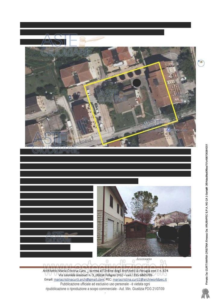 Diritti di piena proprietà per l’intero (quota di 1/1) dei seguenti beni immobili siti in Spoleto (PG), fraz. San Giovanni di Baiano, via Carlo Meloni n. 12: - fabbricato residenziale unifamiliare del tipo “villino” di 315 mq (375,48 mq di superficie commerciale), posto su due piani (piano terra e primo), censito al Catasto Fabbricati del Comune di Spoleto al foglio 172, part. 340, sub. 5;- fabbricato in legno a destinazione magazzino/locale di deposito di 17 mq, situato a circa 1,50 m di distanza da fabbricato di cui sopra, censito al Catasto Fabbricati del Comune di Spoleto al foglio 172, part. 340, sub. 6;- corte esterna di 1.333 mq censita al Catasto Terreni del Comune di Spoleto al foglio 172, part. 340.Si specifica che le particelle individuate al C.F. al foglio 172, part. 340, sub. 5 e sub. 6 derivano dalla soppressione, eseguita in data 16/10/2023, della part. 340, sub. 4 (cfr. variazione del 16/10/2023), oggetto di pignoramento, notificato in data 31/07-04/08/2023 e trascritto in data 08/09/2023.Stato di occupazione del lotto: i beni risultano occupati debitore esecutato. PROFESSIONISTA DELEGATO ALLA VENDITA: AVV. FRANCESCO SENSI (tel. 0742 774284)GIUDICE DELL’ESECUZIONE: DOTT. ALBERTO CAPPELLINICUSTODE GIUDIZIARIO: ISTITUTO VENDITE GIUDIZIARIE PERUGIA (075 5913525 - 0743 45107).